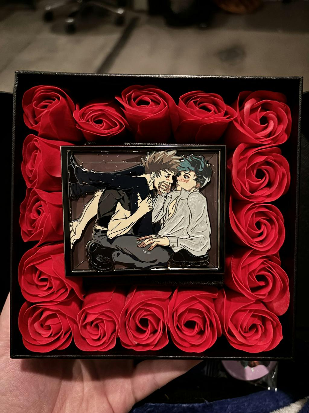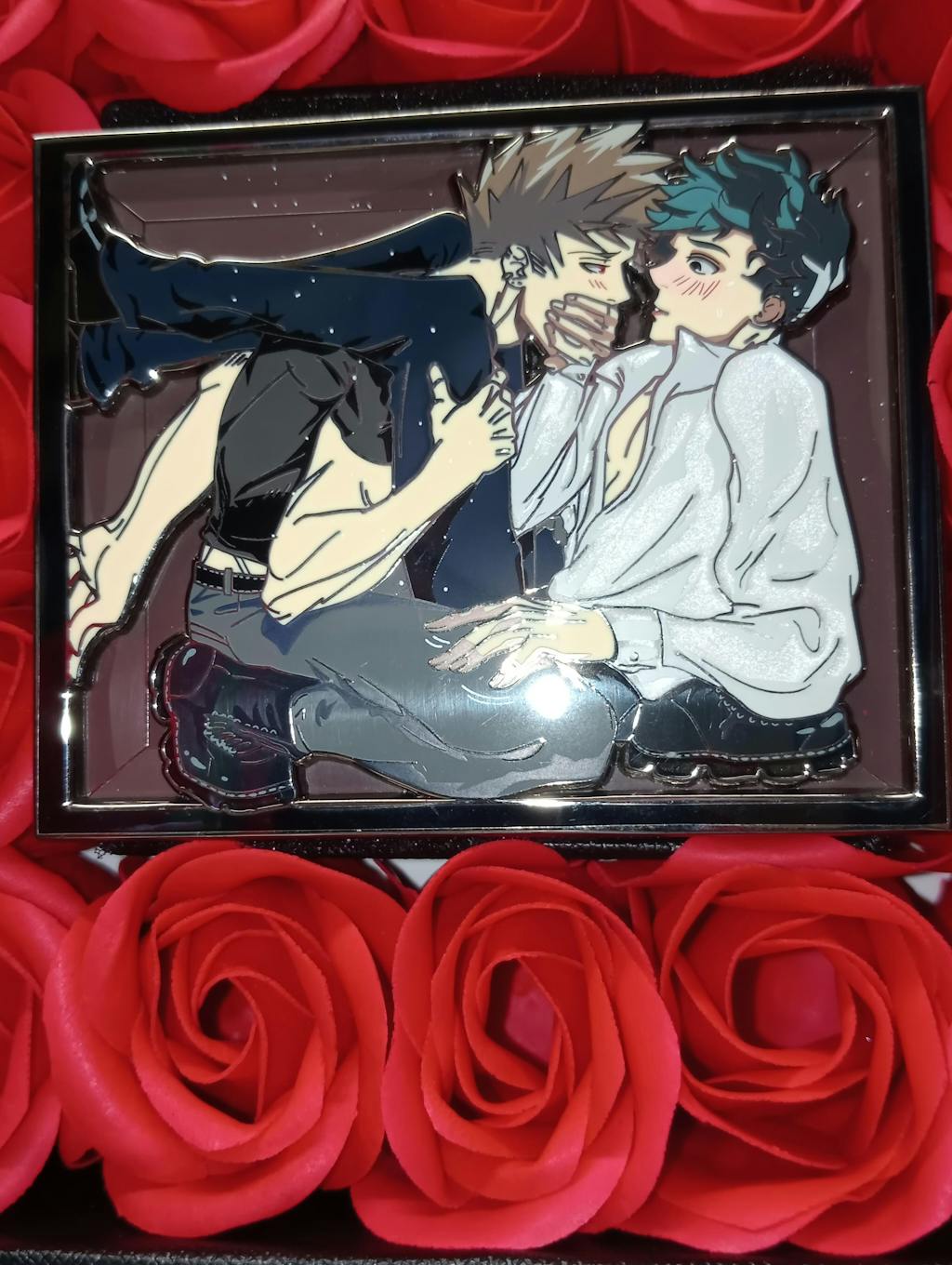 Want a box for the boys to be stuck in, I gottcha! A decorative box to hold your pin. A bow stuck to the outside of box and when opened the pin is on a foam base surrounded by roses, to add to the very romantic situation the boys have found themselves in.